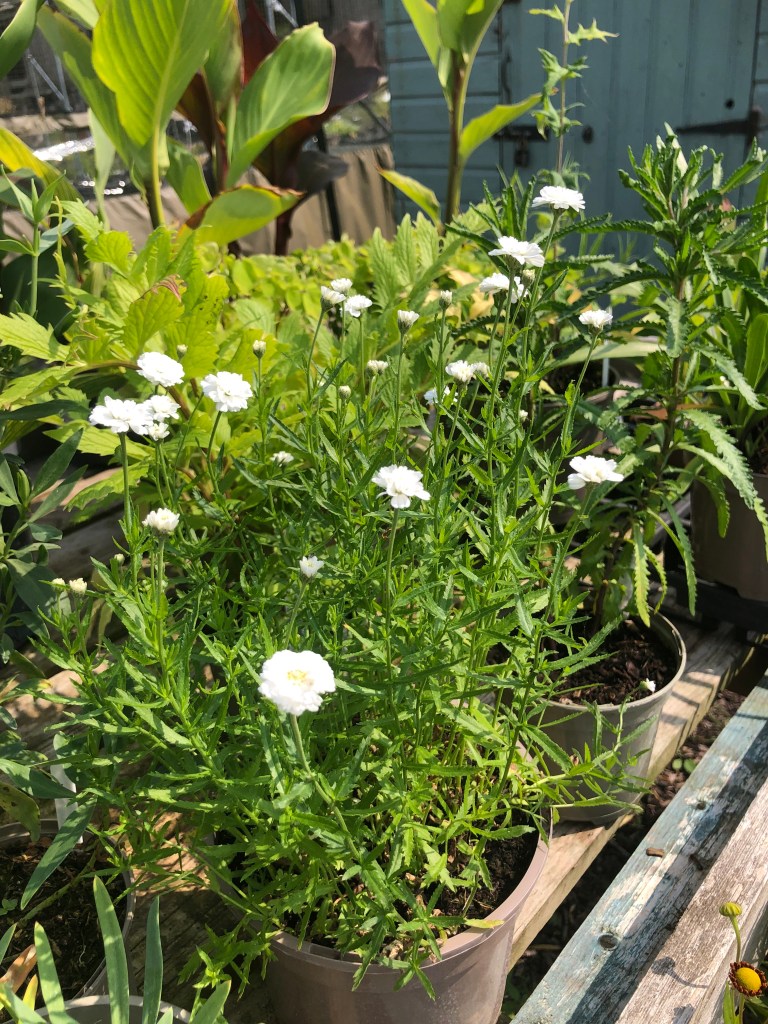Achillea ptarmica ‘Marshmallow’ (Yarrow) A prolific, long flowering dwarf achillea. Clump forming and compact reaching 30cm in height. Plant in full sun in well drained soil. Dead head regularly to prolong flowering.